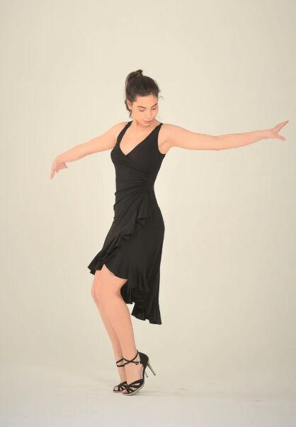 Подчеркните свой стиль в этом великолепном платье с сексуальным V-образным вырезом и накладным запахом. Многослойные оборки добавляют элегантности, а красивая кружевная деталь на спине придает образу дополнительную женственность. Отлично подходит для вечеринок танго и сальсы, милонг, танцевальных мероприятий, в качестве коктейльного платья и платья для выпускного вечера. Изготовлено из высококачественного трикотажа, мягкого и эластичного.